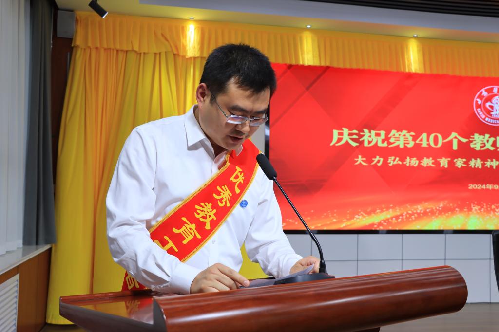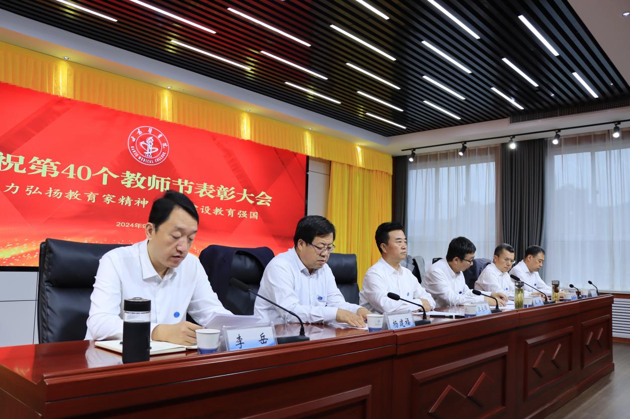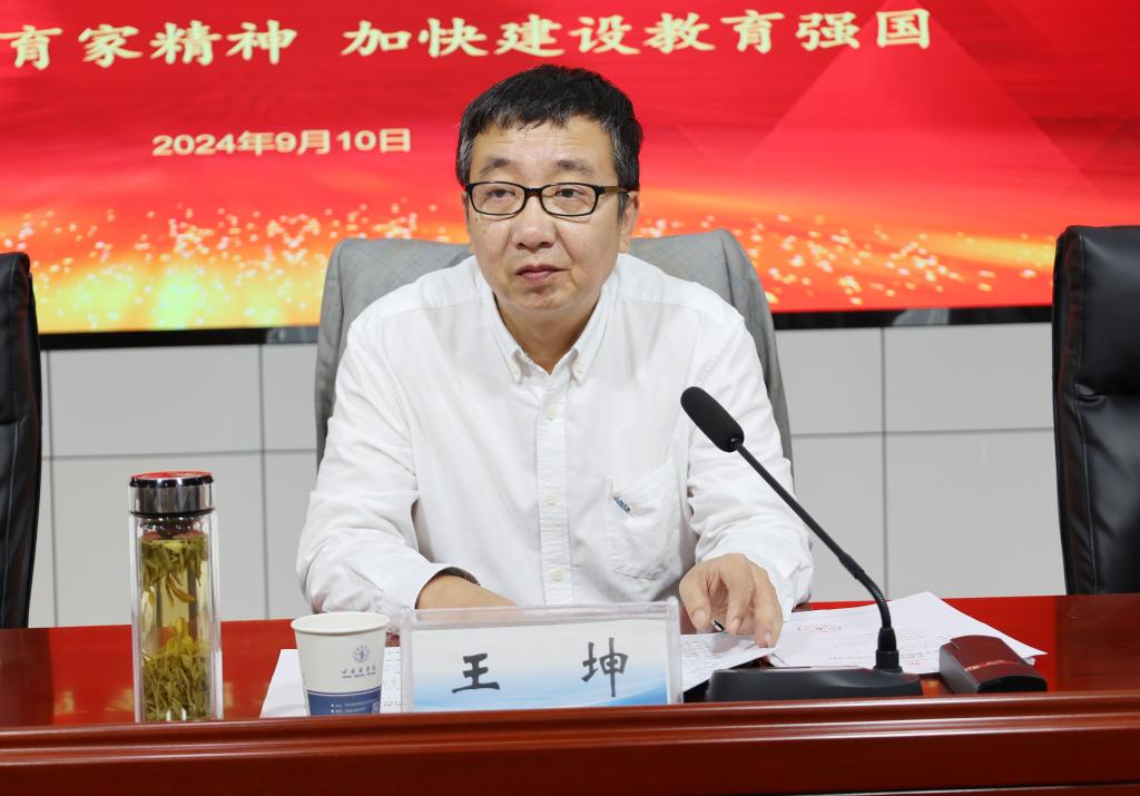 王坤在主持会议时表示,全体教职工要弘扬教育家心有大我、至诚报国的理想信念,筑牢立身从教、教书育人的信仰之基。要弘扬教育家言为士则、行为世范的道德情操,引导学生明德向善、成人成才。要弘扬教育家启智润心、因材施教的育人智慧,让每个学生都有赢得人生出彩的机会。要弘扬教育家勤学笃行、求实创新的躬耕态度,引领学生成为乐学善问的学习者。要弘扬教育家乐教爱生、甘于奉献的仁爱之心,培养仁心仁术的医学生。要弘扬教育家胸怀天下、以文化人的弘道追求,筑牢学生文化自信的精神基石。