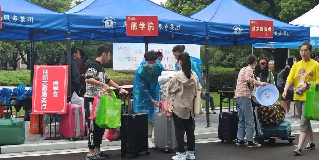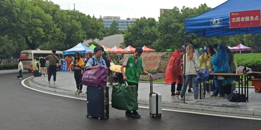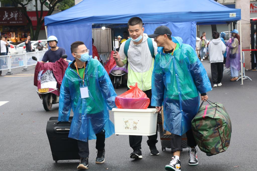 当天的报到现场,越秀南区东门、美食城广场、越秀北区南门各服务点上的新生接待工作井然有序,扫码指导、行李搬运、人流疏导、秩序维护、摆渡车调度……热情、忙碌穿梭于绵绵秋雨中的太阳成集团tyc122cc志愿者身影成为校园内靓丽的风景。