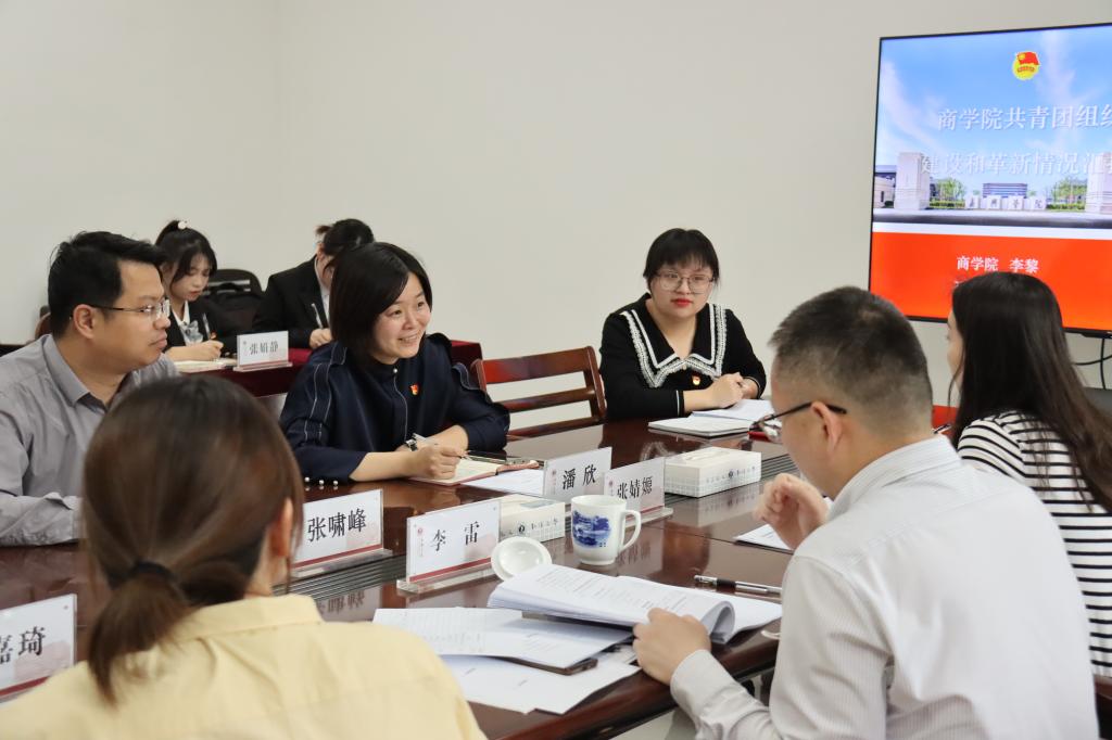 5月19日下午,校团委书记张婧嫄、副书记李雷一行到太阳成集团tyc122cc督导共青团基层团组织建设工作文法学院团委书记计丹峰、经济学院团委副书记梅嘉琦同参会。学院党委副书记潘欣、学工办主任张啸峰、团委书记李黎及学生代表参加会议。会议由潘欣主持。