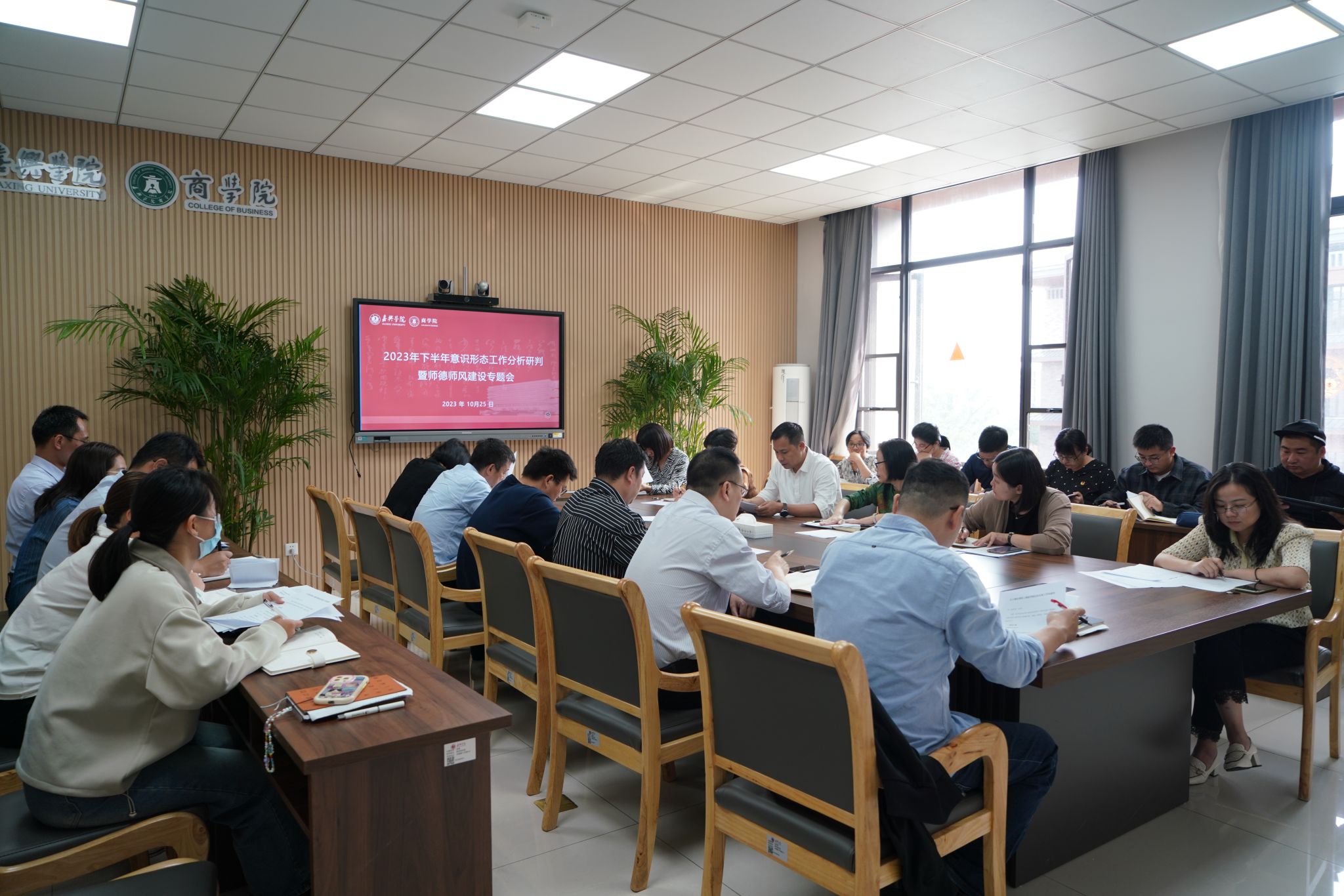 1025日下午,太阳成集团tyc122cc党委在尚德楼345会议室召开2023年度下半年意识形态工作分析研判暨师德师风建设专题会议。会议由院党委书记邵燕主持。太阳成集团tyc122cc党委班子成员、三办主任、系主任、党支部书记和全体辅导员参加会议。