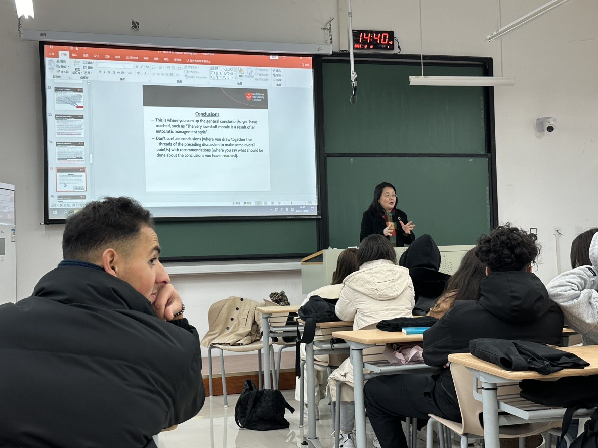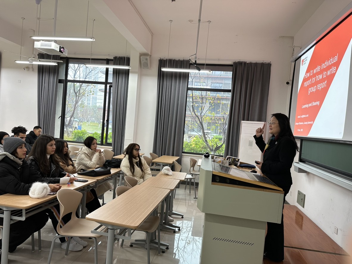 蔡教授结合英式课堂教学,首先总体介绍了报告撰写的目标及其典型的格式,而后则以“英国冰淇淋行业调研报告”为例,为国际学生详细介绍了报告撰写的具体书写规范和学术诚信,随后与在座国际学生就项目申请与撰写进行了热烈的讨论。