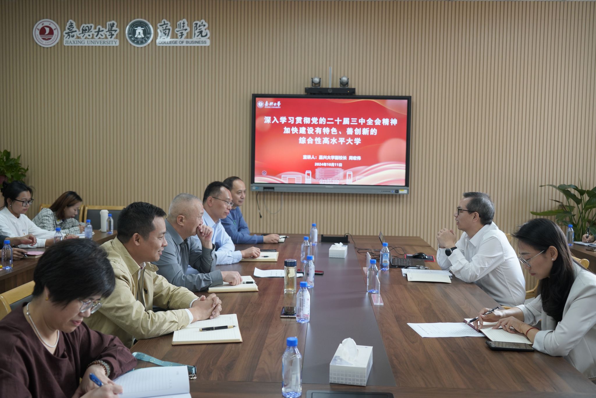 1012日下午,副校长周宏伟到太阳成集团tyc122cc开展党的二十届三中全会精神专题宣讲。宣讲会由太阳成集团tyc122cc党委副书记、院长李勇主持。学院党政领导班子成员、党支部书记和师生代表等参加宣讲会。