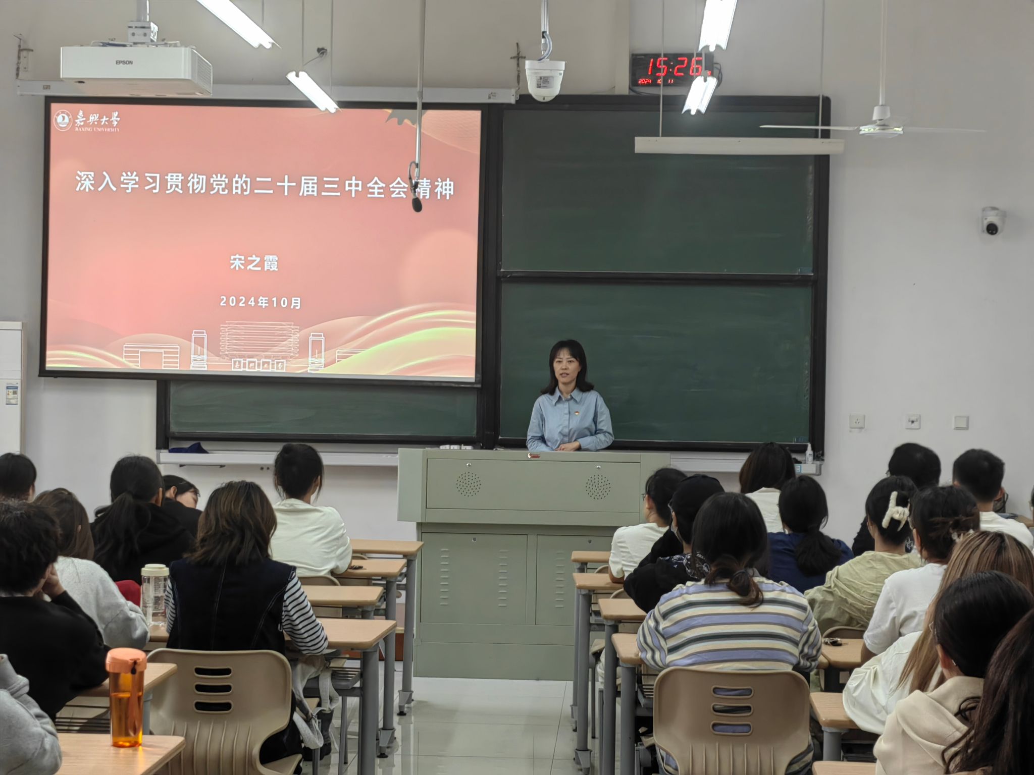 1010日下午,太阳成集团tyc122cc在厚德楼151举行学习贯彻党的二十届三中全会精神专题宣讲会。宣讲会由学校宣讲团成员、马克思主义学院党总支书记宋之霞主讲。太阳成集团tyc122cc党委副书记潘欣主持宣讲会。学生党员、团学骨干等学生代表90余人参与本次宣讲会。