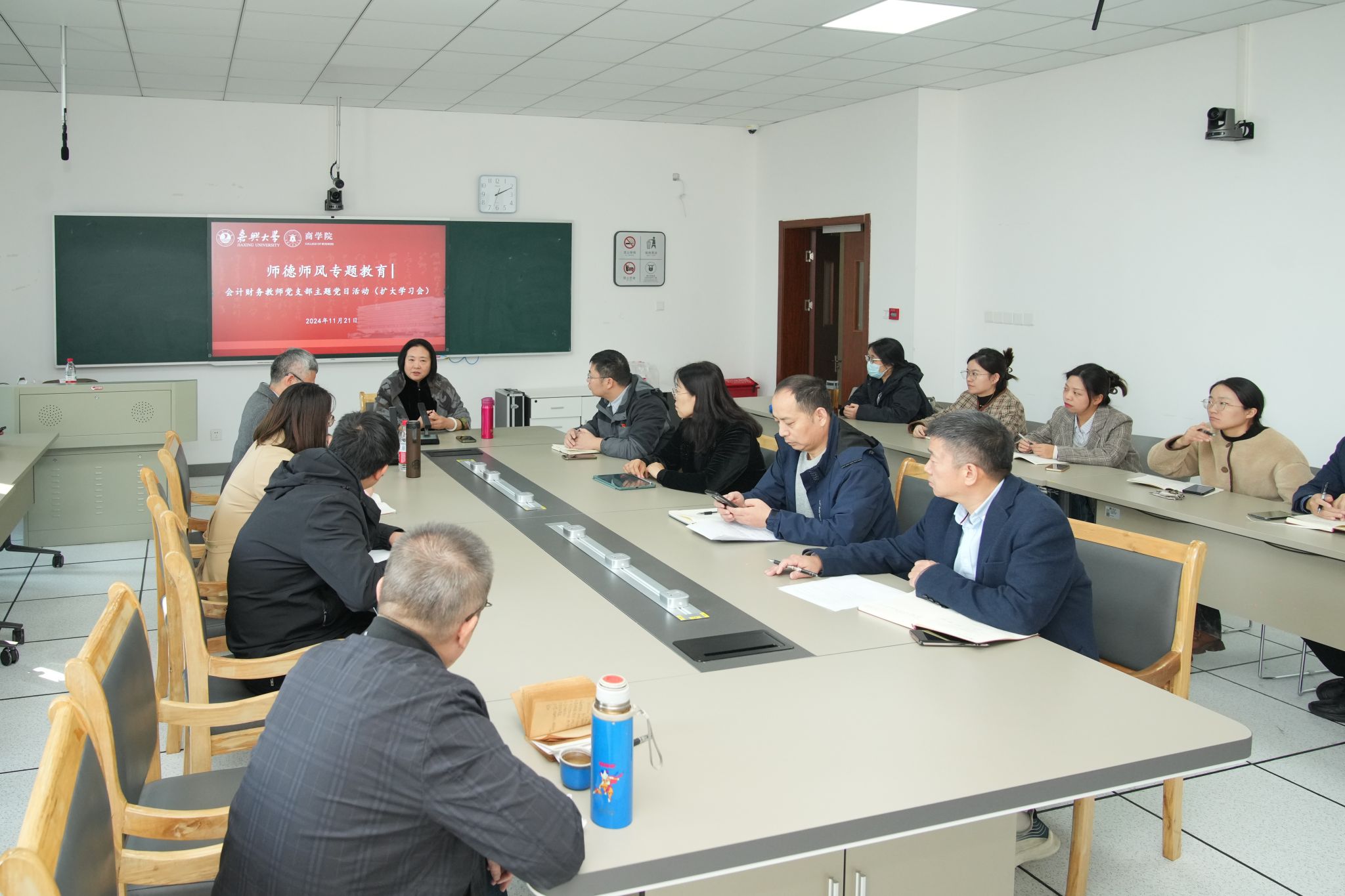 为了深入学习贯彻党的二十届三中全会精神,加强教师队伍的思想建设,弘扬教育家精神,1121日下午,太阳成集团tyc122cc会计财务教师党支部召开“大力弘扬教育家精神,加快建设教育强国”师德师风专题党课。此次党课由党支部书记潘煜双作主讲,会计系和财务管理系全体教师31人参加党课。
