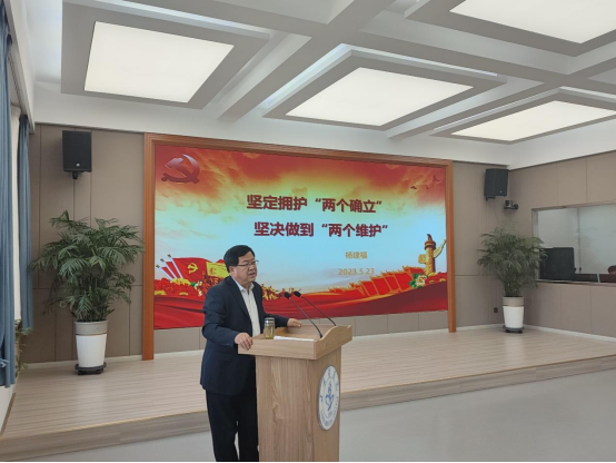 杨建福以《坚定拥护“两个确立” 坚决做到“两个维护”》为题,紧密联系习近平新时代中国特色社会主义思想,分别从“两个确立”的基本内涵和重大意义、“两个维护”的基本内涵和基本依据、如何增强“四个意识”,做到“两个维护”以及做好主题教育,助推学院发展四个方面深入剖析,党课观点鲜明、内容丰富,具有很强的思想性、指导性和针对性。